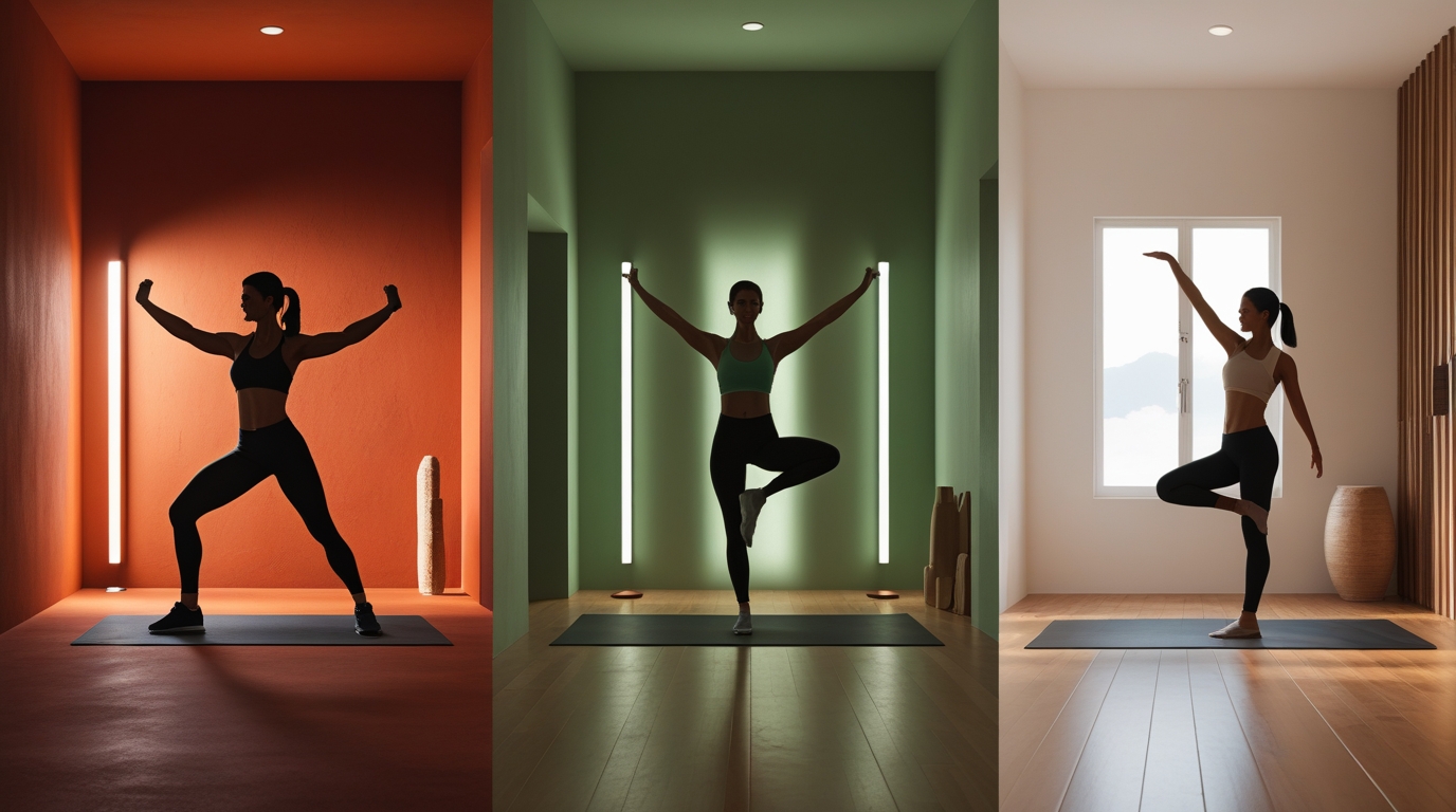 Современные умные лампочки с возможностью изменения цвета — один из самых эффективных и бюджетных способов внедрения цветовой психологии. Вы можете создавать различные световые сценарии для разных типов тренировок: красное освещение для силовых, оранжевое для кардио, синее для растяжки.