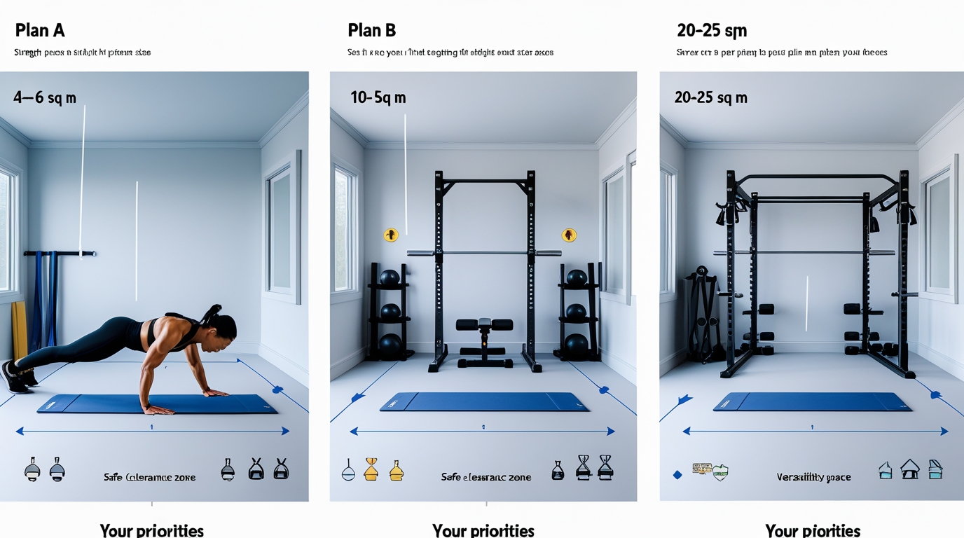 В домашнем тренажерном зале такого размера эффективно работает зональное планирование. Выделите 3-4 квадратных метра под кардиозону с велотренажером или эллипсом, 4-5 квадратных метров для силовой зоны со скамьей и стойкой, и оставшееся пространство для функциональных упражнений.