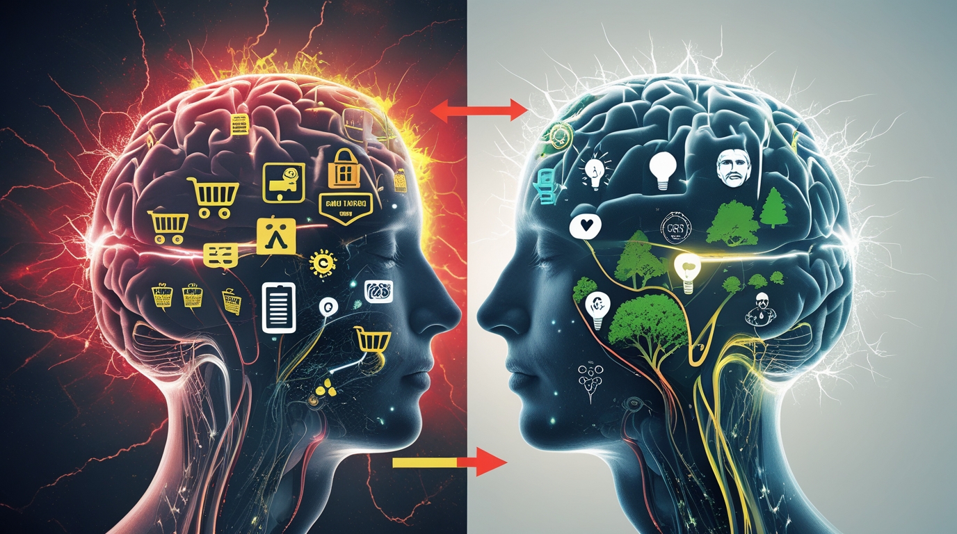 | Покупки | Импульсивные покупки, шопинг как развлечение или терапия, чувство вины после, финансовый стресс | Осознанные покупки, пауза и размышление, качество важнее количества, финансовая стабильность |
