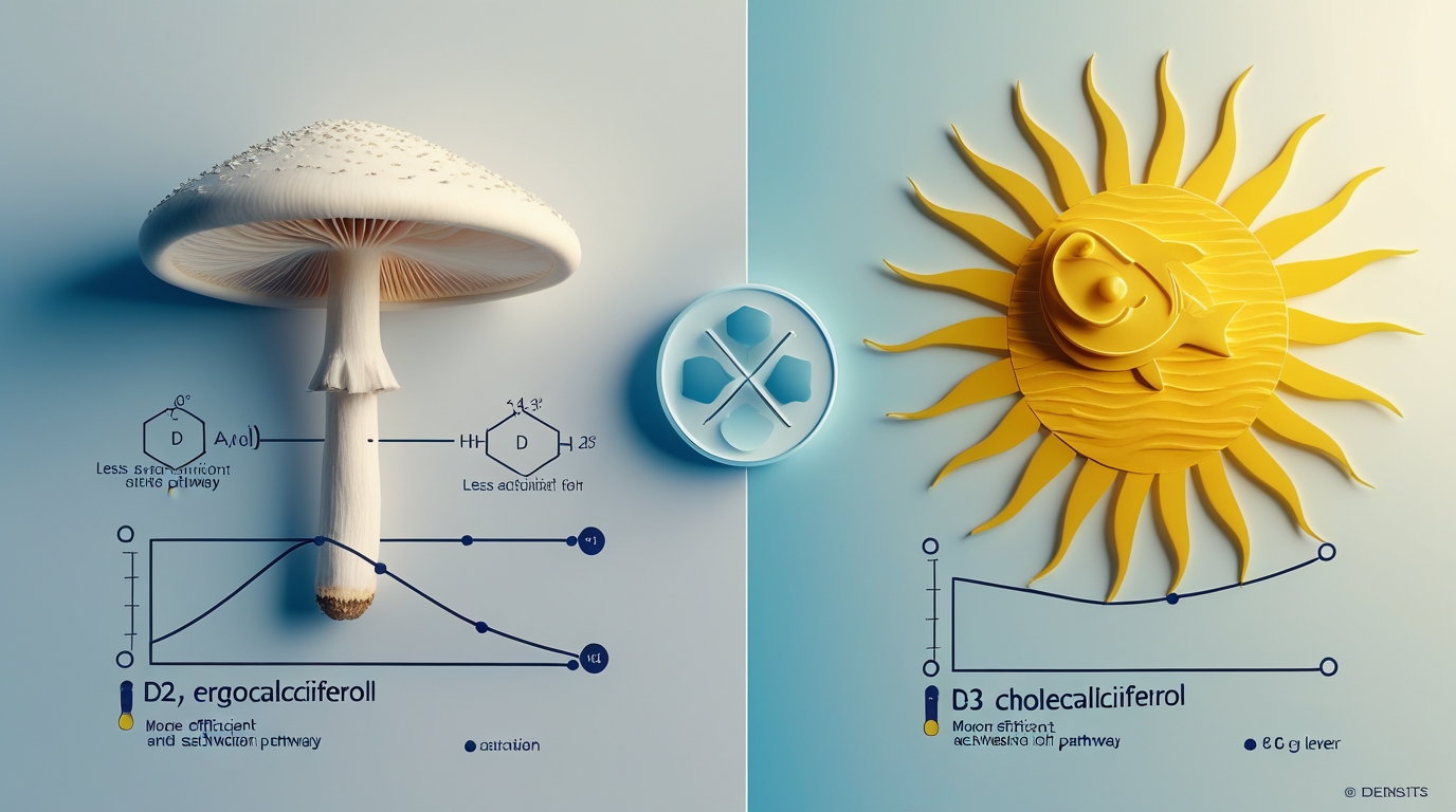Различия в молекулярной структуре этих двух форм приводят к разной скорости их метаболизма. Витамин D2 быстрее расщепляется и выводится из организма, что требует более частого приёма или более высоких доз для поддержания оптимального уровня. Витамин D3, напротив, имеет более длительный период полувыведения и обеспечивает более стабильный уровень в крови.