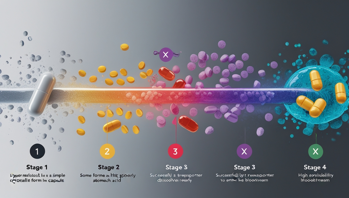 Когда вы принимаете витаминную добавку, она проходит сложный путь через пищеварительную систему. Сначала капсула или таблетка растворяется в желудке под воздействием соляной кислоты. Затем активные компоненты должны пройти через стенку кишечника, попасть в печень через портальную вену, где часть вещества может быть метаболизирована, и только после этого достичь системного кровотока.