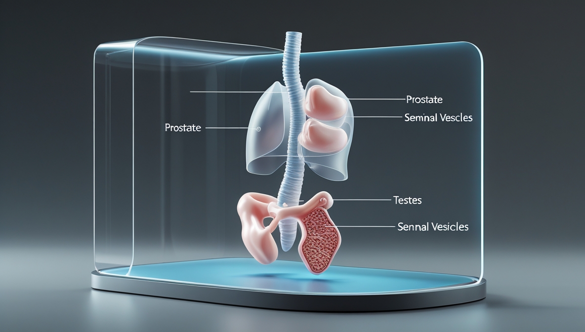 - Medical cross section illustration of male internal reproductive system showing testes, epididymis, vas deferens, seminal vesicles, prostate gland, and bulbourethral glands in anatomical position, highly detailed, anatomically accurate, educational medical style, no text