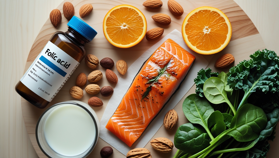 Особенно важно включить в рацион продукты, богатые фолиевой кислотой: темно-зеленые листовые овощи, спаржу, брокколи, цитрусовые, бобовые. Для получения железа полезны красное мясо, печень, гранаты, тыквенные семечки. Кальций можно получить из молочных продуктов, кунжута, миндаля.